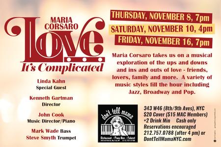 Maria Corsaro takes us on a musical exploration of the ups and downs and ins and outs of love - friends, lovers, family and more - in her cabaret debut show "Love...It's Complicated." A variety of music styles fill the hour including Jazz, Broadway and Pop.