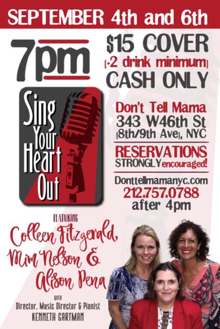 Join us at Don't Tell Mama as the participants of Kenneth Gartman’s “Sing Your Heart Out Cabaret Workshop” celebrate the culmination of this 6 week intensive training program by presenting a full cabaret show with 10-15 minute sets each.